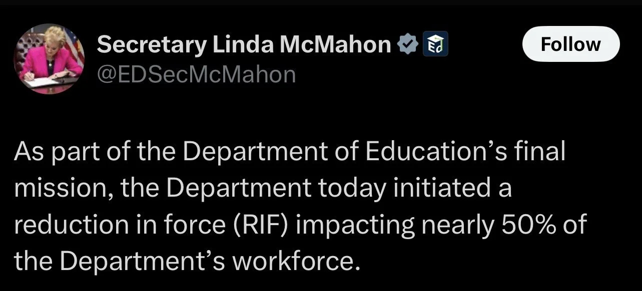Today, the Department of Education announced a mass firing, slashing nearly 50% of its workforce after telling employees to vacate the building. This isn’t just the destruction of a federal agency—this is the beginning of a humanitarian crisis for millions of students with disabilities.