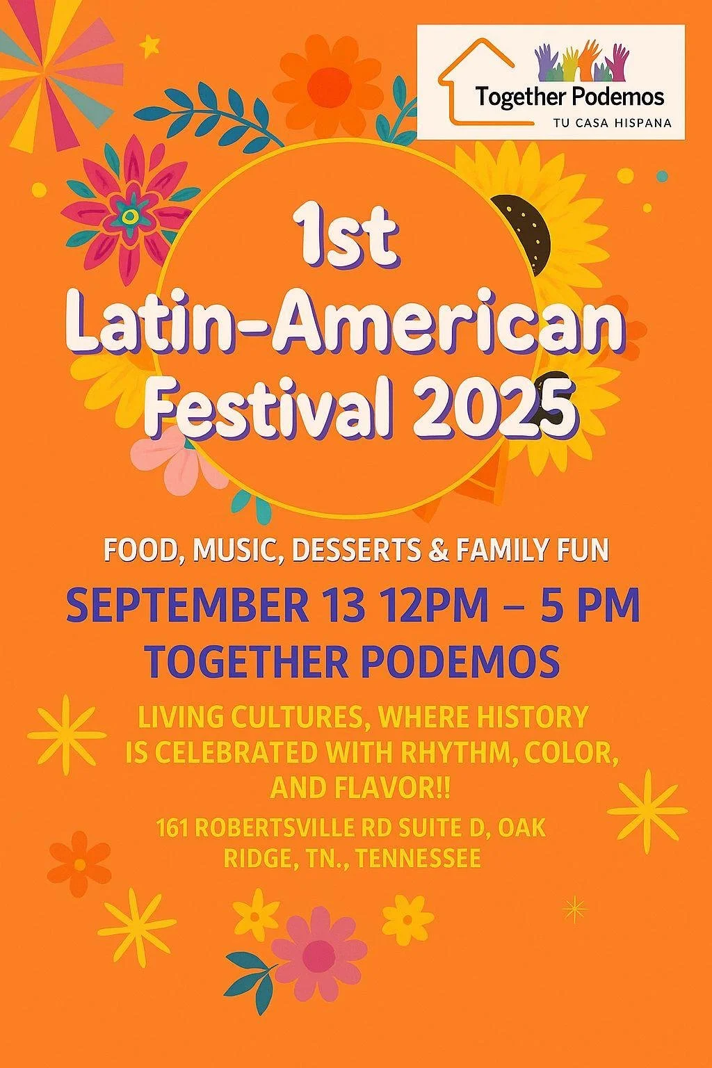 Back to All Events Latin-American Festival Saturday, September 13, 2025 12:00 PM 5:00 PM Together Podemos (Suite D) 161 Robertsville Road Oak Ridge, TN, 37830 United States (map) Google Calendar ICS Join Together Podemos for an afternoon of food, music, desserts, and family fun!This is the very first Latin-American Festival in our community — Living Cultures, where history is celebrated with rhythm, color, and flavor. Come be part of it!